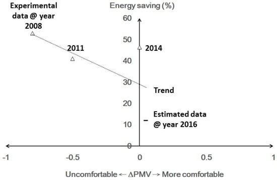 The calculation of energy savings in Equation (1), as well as personal comfort of PMV index in Equation (2), are further discussed quantitatively in this section. The energy saving data of all cases presented in Table 2 could be separated into two types: estimated or experimental data. The estimated data came from estimation of simulation of air conditioner for obtaining energy savings. The experimental data came from actual smart air conditioner enabled by a sensor. The energy savings in %, based on Equation (1), with respect to required cases at each year were plotted, as shown in Figure 3.