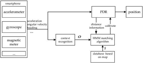 The structure of context-recognition-aided PDR localization method based on HMM is shown in Figure 1, and is mainly divided into three parts: PDR positioning, context recognition and the matching algorithm.