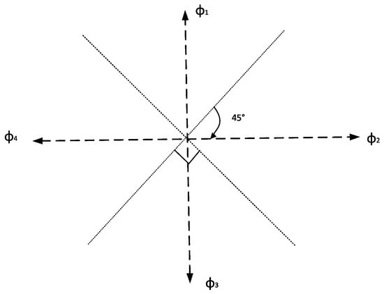 calculated by the nonlinear model proposed in [6] using acceleration measured by the accelerometer. Moreover, θi is the heading of this step and considering the low accuracy of smartphone and the impact of various magnetic devices indoors, it is constrained to four directions [φ1,φ2,φ3,φ4] using Equation (2) proposed in [17] after the moving direction is measured by the gyroscope and the magnetic meter, as shown in Figure 2.