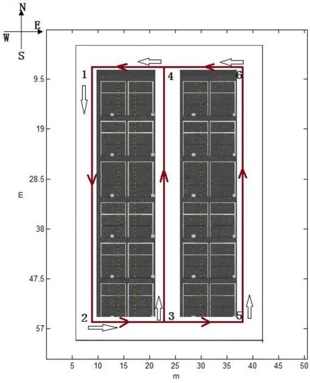 The following performance results are based on the data collected from a XiaoMi 3 smartphone mounted on the experimenter’s waist, as shown in Figure 5. Nearly 60 tests were performed by three students (with heights of 1.65 m, 1.7 m, 1.73 m) walking at a normal speed (1.1 m/s, 1.2 m/s, 1.2 m/s on average, respectively) in two environments. One is part of the parking garage with six corners in the Beijing New Technology Base of the Chinese Academy of Sciences, which is approximately a 35.07 m × 57.62 m area, as shown in Figure 3. The other is a test environment with seven available rooms on the 8th floor, which has an area of 54.95 m × 16.8 m, located in the main building of our workplace, Academy of Opto-Electronics, Chinese Academy of Sciences, as shown in Figure 9. In the parking garage, the experimenters walked straight along the path and do not turn, unless they wanted to turn around the corner as indicated by the brown line in Figure 3. And as for the experiments on the 8th floor, we walked straight along the corridor and turned 90° towards to the door when we wanted to enter a room. After taking a few steps following the room’s orientation, we turned 180° and walked for several steps before turning 90° to guarantee that we are walking along the corridor again. In Figure 9, the brown line shows the trajectory if the pedestrian’s route is room6-room5.