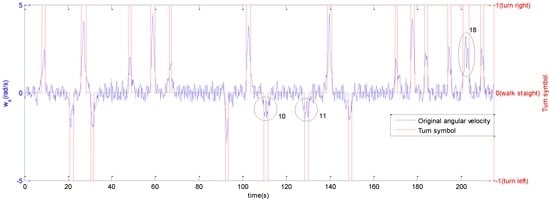 When the pedestrian turns, the angular velocity undergoes a severe change compared with the normal walking process whose angular velocity is around 0. A random sample of the original angular velocity of one experimental subject is the blue line shown in Figure 4.