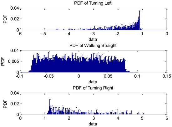 In Figure 6, th represents the angular velocity threshold which is a positive number, and “Symbol” stands for the turn symbol during the process of turning, which is 1 if turning right, and −1 if turning left. The choice of th is dependent on the statistical analysis of angular velocity collected by the XiaoMi 3 smartphone (XiaoMi, Beijing, China) after we turned 840 times with an angle of ±90° while walking straight. The mean value, variance and probability density function (PDF) are shown in Table 1 and Figure 7. The parameters of the sensors on the XiaoMi 3 are shown in Table 2 [29,30]. It needs to be explained that the orientation sensor measuring the heading is not a real sensor but rather a software sensor which gets its values from combining accelerometer and magnetic field values and applying certain calculations [31].