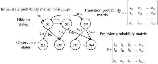 A shows the transition probabilities among any two hidden states in HMM, where means the probability that the state is sj at time tj under the condition of the state being si at time ti (i < j). The transition probability satisfies and .