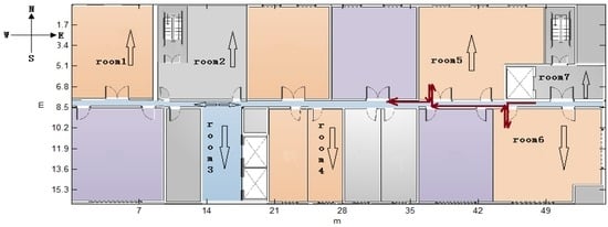 The observed state set is composed of all possible observed state o and o is a context detection event that can be observed directly. Taking the corner as an example, o includes the detected corner and its orientation. The orientation of a corner has been illustrated in Section 2. Meanwhile, we define the orientation of the room as the heading after the pedestrian enters this room and the corridor’s orientation may be east or west, according to the various walking routes by definition, as shown in Figure 9. Thus, the measured heading can decide whether the pedestrian is walking into or out of a room if we ignore one’s turn actions in the room. From the above definition, a subset of corners can be matched by each turn action and its measured information.