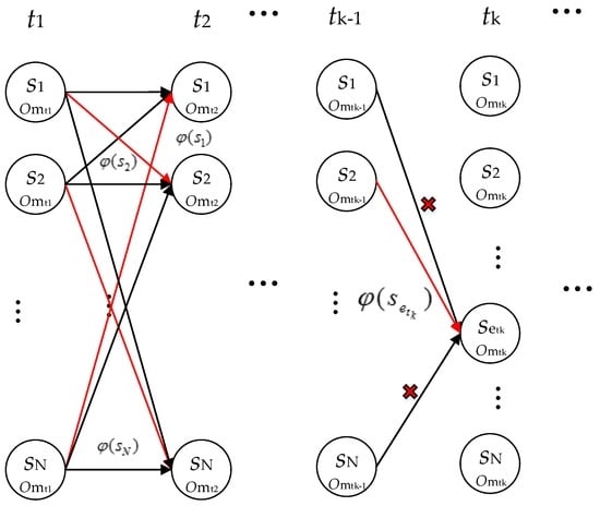 In this way, the optimal sequence can be obtained by the five elements defined in Section 4.1. In our paper, we use the Viterbi algorithm to solve this issue [34,35]. At present, the Viterbi algorithm has two types: method of exhaustion and recursive algorithm [36]. Considering the high efficiency of the recursive algorithm mentioned in [37], we use the recursive algorithm in the proposed method.