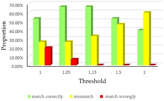 The histogram manifests that the wrong matching matter occurs if the threshold is relatively small because of the similarity of some paths. When the threshold value grows, the rate of matching wrongly reduces and the mismatch rate rises correspondingly because the probability ratio Pmax1/Pmax2 cannot reach that high. This result confirms the impact of thp mentioned at the start of this subsection.