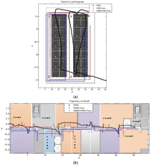 The trajectories of different algorithm. (a) In parking garage; (b) on the 8th floor.