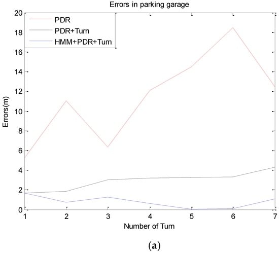 The comparison of positioning errors by different methods. (a) In parking garage; (b) on the 8th floor.