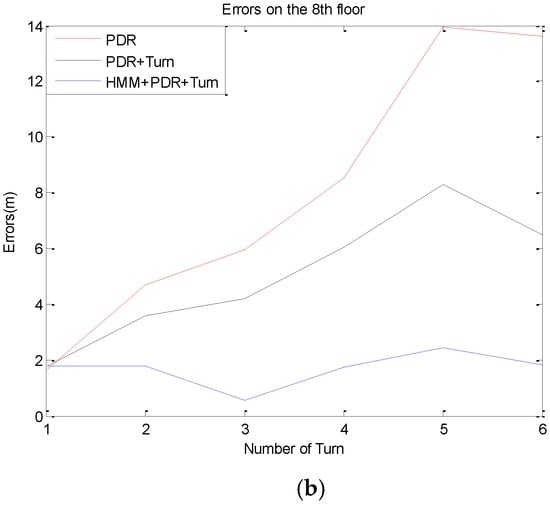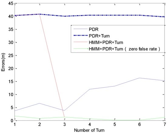 Figure 15 shows positioning errors of a simulated experiment, where the second recognized context is removed from the real data of the experiment shown in Figure 13a. We can see that the PDR is not affected by the context recognition. In PDR + Turn method, the heading between two recognized corners is constrained to a unitary angle based on PDR, so it causes the enormous errors when the missed context recognition happens. The errors using HMM + PDR + Turn are large before the correct matching because it uses the same heading optimization algorithm as PDR + Turn, but it is corrected immediately once the matching is successful, and keeps the same accuracy and stability with the method in the condition of zero false rate, no longer affected by the missed detection before.