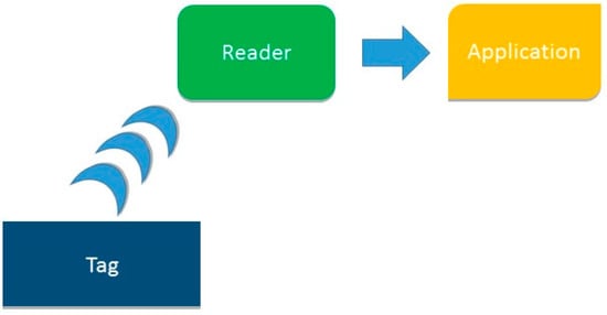 The technology emerged in 1940 and its origin is related to the development of other technologies such as computers, mobile telephones, wireless networks, satellite communications and GPS. The United States military employed an RFID system to remotely identify possible attacks using the classification (Friend or Foe) emitted from any detected plane. At the end of the war, a period of slow but continuous research into this technology began. The publication “Communications by Means of Reflected Power in the Proceedings of the Institute of Radio Engineers” by Harry Stockman in October 1948 can be considered the first research publication into RFID []. The diversity of components of RFID technology allows for the building of a large number of different systems. However the working method for all systems is the same: a tag attached to the object or person you want to identify emits a radiofrequency signal with identifying information; a reader receives it and sends the data to a computer application which processes it. This process is illustrated in Figure 1.