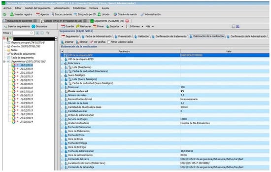 A very different case is obtaining the traceability of patients and medication in the case of those drugs which are considered to be of high risk and cost, given that their precise dosage control facilitates the sustainability of the public health service, as is the case with the Day Hospital. We were granted a second research project, also financed by the Instituto de Salud Carlos III (Project PI10/02442), focused on medical treatments prepared in the Pharmatechnical Unit of the Pharmacy Service and administered by the Day Hospital at the CHUAC. These treatments are prescribed for rheumatologic, neurologic, and digestive pathologies and developed in line with the pharma-therapeutic profile of the patient. A number of systems have been developed, as studied here, to obtain the traceability of patients and medicines using new technologies [,,] such as RFID and study its effectiveness in routine clinical practice for health personnel in a hospital.