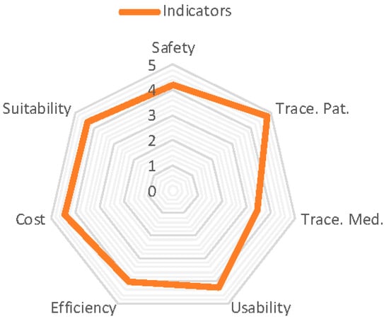 The highest value relates to the traceability of the patient (4.78), where the RTLS system is capable of locating to a precision of between 1 and 4 m and less than 5 for the number of patients, especially elderly patients forgetting the device. The second highest value relates to the suitability of the system to routine clinical practice (4.38); we can conclude from this that we must include the collaboration of the majority of future users in the project analysis and the stages of design, implementation, tests, and beginning of the project. Certain adjustments to the system have been made which have caused delays to the project development, but this has contributed to the suitability of the system and its development for routine clinical practice in the hospital. The next section will analyse the results shown in the previous figures and the conclusions drawn.