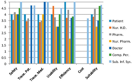 The nursing personnel experienced an excess of work at the beginning of the learning process, as can be seen in the efficiency indicator (3.71 in their category), but recognized the safety issue, as is shown by the safety indicator in their professional profile (Figure 5). The general learning process of the sanitary staff could be minimized by organizing a series of longer sessions; this would also allow for the use of this system in other hospital services.