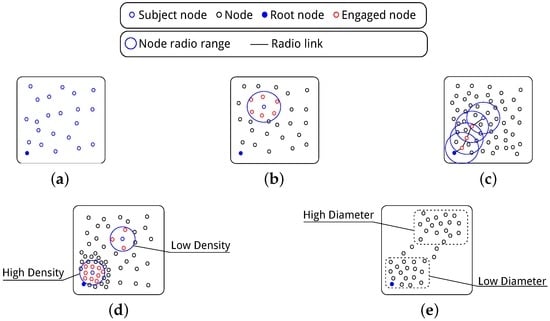 Illustration of the manifestation of the physical features in the network. (a) Size is 22: Total number of nodes that constitute the network; (b) Density, 6: The number of nodes within communication range; (c) Diameter, 4: Minimum number of hops necessary to reach the root; (d) Illustrating a high standard deviation in terms of network density. This scenario can occur when a number of highly sensed environments exist with sparsely sensed environments within the same network; (e) Illustrating a high standard deviation with regard to network scale. This occurs commonly within buildings when nodes in geographically spaced rooms exist on the same network.