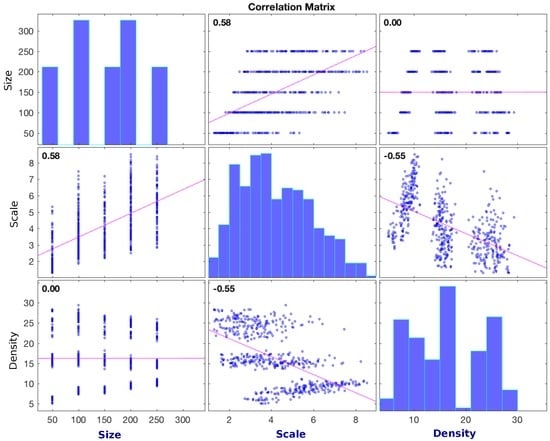The size, density and scale are linked, with each feature dependent on the other two. For example, if density and network scale are both high, the network size must be large. A high network density with low number of nodes would indicate a low scale. The dependency is defined in Table 1 outlying the Pearson correlation [28] between each variable and displayed in a correlation matrix in Figure 4. Both the table and the graphs imply a strong correlation between density-scale and scale-size. These are expected results from the experimentation phase. During simulations the main variables used were network size and physical area of the network. To asses a range of densities of a given network size the network area is varied dictating a change in scale. A change in the size of the network also dictated a significant change in scale as denoted by the p-values. The points in the graph represent the features of each of the 559 generated network variations used in the testing phase described in Section 7. The graph includes the networks from both training and test data sets.