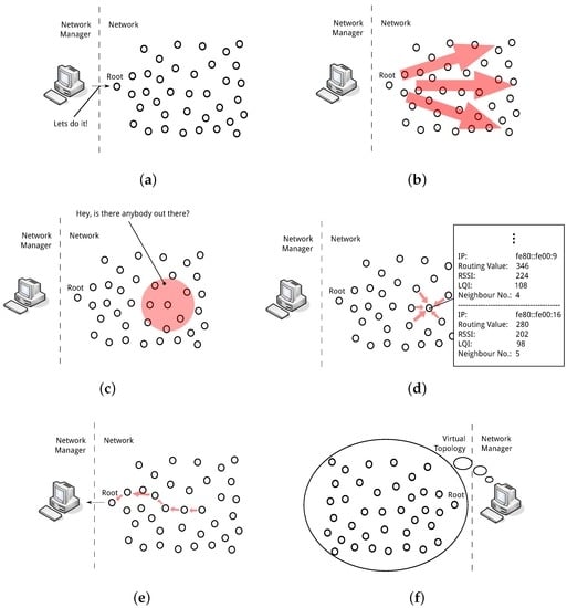 Information gathering process instigated by network manager. (a) The network manager sends a message to the root of the network instigating the information gathering process; (b) The root relays this message to all nodes in the network; (c) Each node in the network sends out a beacon requesting information from its neighbours; (d) The neighbouring nodes send a reply and a neighbour list is generated with physical link information included; (e) Each node in the network sends its neighbour list back to the root of the network and this information is then passed to the network manager; (f) The network manager maintains a virtual topology with the network information from which it can extract the physical features.