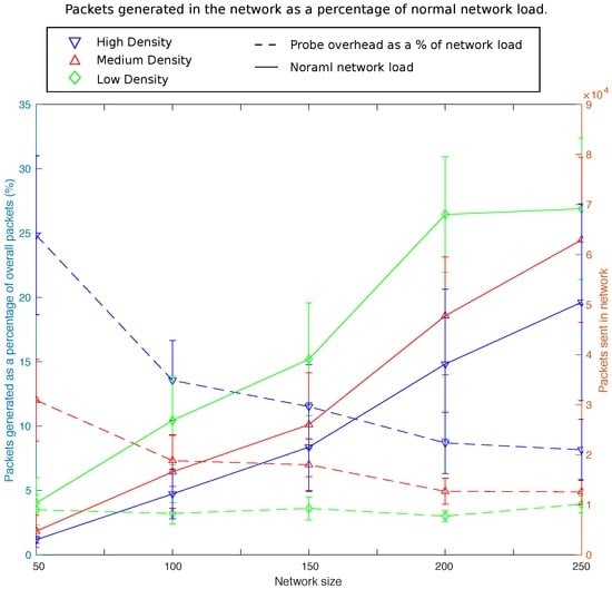 The figure shows results over a range of network sizes and densities. In general a higher load is observed in the network at lower densities. This is in part due to larger number of retransmissions in the network as well as observing a larger diameter compared to more dense networks of similar scale. The frameworks probing process shows heavier burden on the network at higher densities. This is due to the addressed reply policy employed by the framework. In dense networks each node will receive many beacons and reply to each of them individually increasing overhead. The data collection overhead as a percentage of the overall load is reduced as the size of the network increases. This is due to the wider diameter of the network at higher scale. While higher network densities will have a large knock on effect on the collection process, the diameter of the network has a lesser impact on the data collection process than that on normal network load.