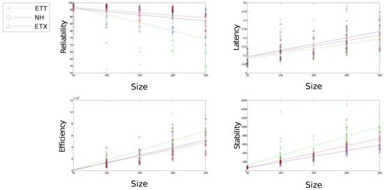 Figure 10 shows all evaluation metrics following a general trend towards poorer results as size increases. Reliability and stability for both ETX and ETX-NH are well defined as size varies with latency and efficiency showing poor correlation.