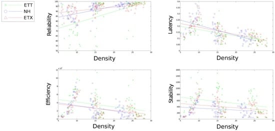 Figure 11 shows a large impact on both reliability and latency effected by the change in density for all communication solutions. Neither efficiency nor stability are affected greatly by a change in density, however, density still proves an important tool for comparing each solution with regard to efficiency and stability. Each solution presents significant performance difference in terms of stability using density to compare solutions with NH presenting marked improvements over the other solutions. Both ETX-NH and ETX present an improvement over ETT with regard to energy efficiency.
