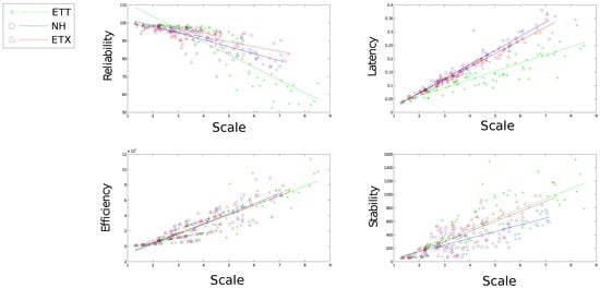 High correlation between scale and each metric performance can be observed from Figure 12. This presents scale as a good indicator of how well a solution might perform in the network. It remains difficult to distinguish between solutions at small scales however higher contrast emerges as scale increases. A particular nuance with reliability is noticed for ETT over increasing scale. ETT shows improved reliability over both competitors for scale less than 4.5 hops. Over this threshold however ETT performs poorly in comparison. ETX and ETX-NH handles increasing scale more gracefully with regard to reliability.