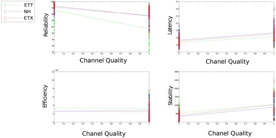 Channel quality is of importance to the Packet Reception Ratio (PRR) on each link. Increasing the average channel quality across the network will increase PRR dramatically affecting the evaluation metrics. Taking an average of the channel quality of all links to a node may not fully represent the quality of the channels that actually get used within the network and as a result may not fully represent performance. This can occur when many “fringe” neighbours appear to a node, none of which are chosen for communication. A more accurate description of the used channel can be achieved by also using the best quality channel available to each node. A number of measurements are used to assess channel quality including Link Quality Indicator (LQI) and Received Signal Strength Indication (RSSI). Such measurements are available using the CC2420 [29] chipset typically used for IoT communications.