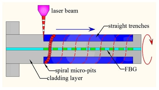 A schematic profile diagram of the proposed FBG sensor is shown in Figure 1. The straight-trenches and spiral micro-pits were fabricated on FBG cladding by femtosecond laser micromachining, which can improve the sensitivity of the sensor, while the spiral micro-pits can make the film–fiber bond stronger.
