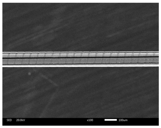 A schematic diagram for the fiber composite microstructure ablated by femtosecond laser is shown in Figure 2. The operating wavelength of the femtosecond laser system (IFRIT-Cyber Laser) was about 780 nm, and the pulse width was about 180 fs. For the micromachining, a standard single-mode optical fiber (about 1532 nm of central wavelength and 125 μm fiber with 10 μm diameter core region) was used. Before fabrication of the microstructure, the polyimide protective layer on FBG (about 125 μm for a single side) was peeled off, and then FBG was fitted in a rotary fixture to fabricate 3D microstructures. Straight trenches are formed when the focused laser beam moves along the fiber surface as shown with the arrow in Figure 2. On the other hand, the machining of spiral micro-pits relies on the rotation of the fiber held by the jig fixture. A scanning electron microscope (SEM) image of the laser-induced composite structure coated with Pd/Ag film is shown in Figure 3.