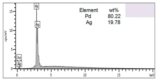 The deposition of the hydrogen sensing film is conducted in a BESTECH sputtering system. Prior to thin film application, the machined fiber samples were ultrasonically cleaned with diluted HF for 2 min to remove fiber debris. Pd and Ag targets were installed to the DC source, and the pre-treated samples were located at bottom center. A thin Pd–Ag film was deposited on the surface of the FBG in high vacuum. Deposition power for palladium alloy targets is 100 W, which corresponds to a deposition rate of about 0.1 nm/s. The film thickness is controlled accurately using a crystal oscillator. In this experiment, about a film of about 500 nm thickness was deposited on the cladding surface of the micro-structured samples with the atomic ratio of Pd:Ag being 4:1, respectively, as shown in Figure 4. In order to ensure the uniformity of the coated film, the fiber rotation should be made continuous. However, dynamic rotation affects the deposition of the Pd layer and reduces the bonding strength of the Pd layer with fiber. Therefore, we selected a static deposition method during the sputtering process; i.e., after a two-hour depositing step completed, the samples were turned 180 degrees, then another two-hour depositing step was carried out.