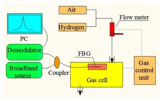 The experimental setup for hydrogen gas measurement and characterization is shown in Figure 5. The hydrogen sensing performance was carried out in ambient air environment and at a room temperature of ~25 °C. One end of the FBG was fitted in a gas cell, and another end of the FBG was connected to a broadband source through a demodulator by a 3 dB coupler. The resolution of the demodulator was 0.1 pm. The varying hydrogen concentrations were monitored by the gas control unit. A real-time drifting FBG spectrum is observed in the computer.