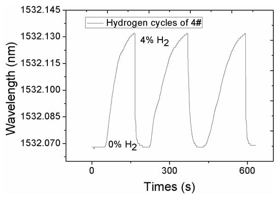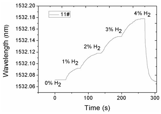 Among all of the sensors shown in Table 2, sensor sample 11# with composite structure produced the highest sensitivity, as shown in Figure 7. When hydrogen concentrations are 1%, 2%, 3%, and 4%, the corresponding wavelength shifts of FBG are 20, 46, 75, and 105 pm, respectively. The sensitivity of the 11# sensor was estimated to be 26.3 pm/%H (wavelength shift caused by the change of 1% hydrogen concentration) through linear fitting. At first, the process of hydrogen absorption takes a long time as hydrogen diffuses through the thick Pd/Ag layer before volume expansion is realized. Thus, the wavelength shift is relatively small. As the hydrogen gas concentration increases and permeates the Pd/Ag film, a good response is realized.