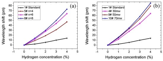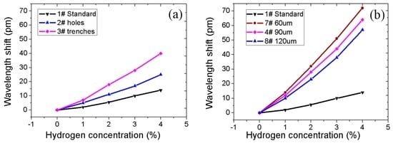 Figure 9a illustrates the response of sensors with different numbers of trenches under different hydrogen concentrations. The wavelength shifts of samples 4#, 5#, and 6# were 47 pm, 64 pm, and 73 pm, respectively at 4%. It can be found that the sensitivity of the sensors increases with increasing number of trenches (n). However, the effect of spiral micro-pits compromises the increase of n. Theoretically, the maximum of n is about 12 under the restriction of fiber cross-section area. In order to optimize the fiber’s mechanical strength and hydrogen sensitivity of the two structures, n should be six or eight.
