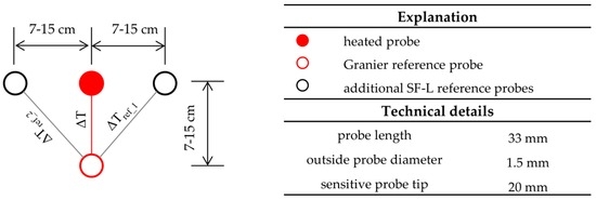 Granier-type thermal dissipation probes [1] are common instruments for quantifying tree water use in forest hydrological studies [2,3,4,5,6]. Upscaled to a ground area basis, tree water use is particularly valuable in accounting for actual tree transpiration when partitioning forest evapotranspiration [7,8,9]. The Granier system consists of two sensor probes inserted radially into the sapwood, one above the other. The upper probe is equipped with a heating element and a thermocouple, thus recording the heat dissipation due to sapflow. The lower probe measures the ambient reference temperature of the wood [10]. Sap flux density derived from the temperature gradient between the two probes using the empirical equation [1,11]: