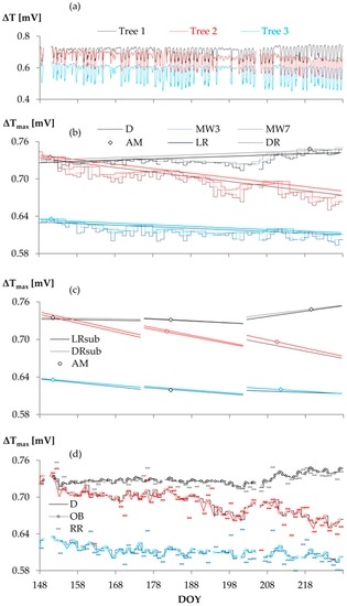 ∆T and ∆Tmax by determination approach and tree: (a) ∆T over growing season; (b) ∆Tmax by moving window (MW3, MW7) and regression approaches applied to complete study period (LR, DR); (c) ∆Tmax by regression approaches applied to sub-periods (LRsub, DRsub); (d) ∆Tmax by physically-based approaches (OB, RR). Abbreviations of ∆Tmax approaches according to Table 2.