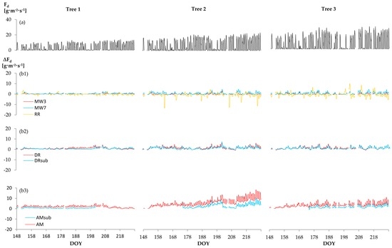 (a) Diurnal sap flux density by tree, calculated by the daily ∆Tmax approach (Fd) and (b) deviations (∆ Fd) from D using those ∆Tmax approaches that yielded the largest Fd differences among each other (b1): Fd deviations from D by MW3, MW7, RR; (b2): Fd deviations from D by DR applied to complete study period and sub-periods; (b3) Fd deviations from D by AM applied to complete study period and sub-periods). Abbreviations of ∆Tmax approaches according to Table 2.
