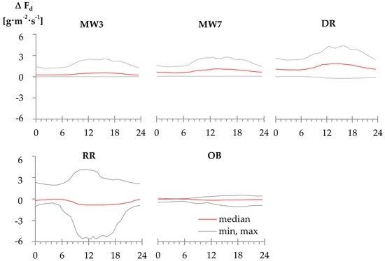 Based on the results of a pilot study in the same catchment, we divided the study period into days of distinct environmental conditions that were found to impact Fd. These were (1) days of low/high global radiation, on which the daily global radiation was 0.5 of the standard deviations below/above the mean daily global radiation between May and September 2012 and (2) wet days, on which daily precipitation was above 5 mm and dry days, which were defined as the second day without precipitation. Days that met these conditions were analyzed separately. Nighttime was defined as the period during which radiation was less than 5.0 W·m−2 [12].
