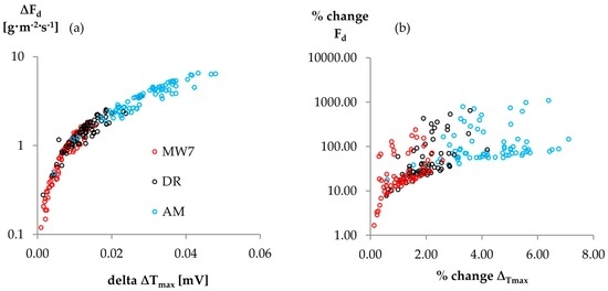 Figure 5 shows the absolute and relative mean daily Fd and ∆Tmax increases for different empirical ∆Tmax approaches. Neglecting the unreliable AM approach, the maximum absolute daily Fd increase was produced by DR, would correspond to a relative Fd increase of 106.0% and was induced by a ∆Tmax increase of only 0.04 mV (5.52%).