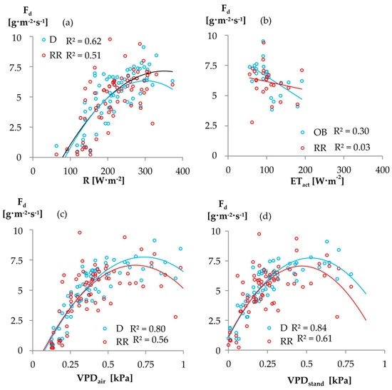 Correlating Fd and climate variables (above-canopy vapor pressure deficit VPDair, below-canopy vapor pressure deficit VPDstand, radiation R; actual evapotranspiration ETact) all ∆Tmax approaches yielded satisfactory coefficients of determination (R2 of 0.62 to 0.75).