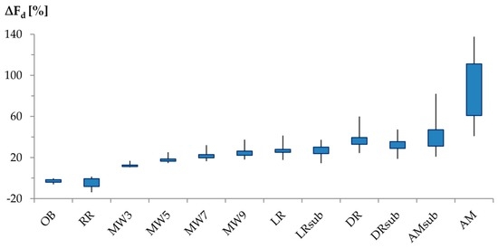 Maximum temperature gradients (∆Tmax) strongly vary depending on the ∆Tmax approach (Figure 2). For the linear and double regressions, the reference period has a major impact on the resulting ∆Tmax trend (Figure 2b,c). While the Oishi “baseliner” shows similar patterns as D, RR yields ∆Tmax values that strongly vary about D (Figure 2d). All empirical ∆Tmax approaches yielded higher mean sapflow densities (Fd) than D (p < 0.01). Fd generally increased with increasing MW width; based on the test statistics (cf. 2.3), MW9 and LR were evaluated as equal (p > 0.1). The largest difference in sap flow density was computed between approaches RR < D < MW3 < MW7 < DR < AM (Figure 3).