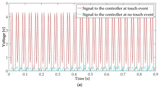 Figure 3a–c show the signal waveforms at the output of the amplifier in the cases of touch and no touch, the logic square wave read by the controller in the case of a touch event, and the frequency spectrum of the touch signal, respectively. As shown in Figure 3a, the input signal to the controller in the case of a touch event has a maximum voltage in excess of 4 V, whereas the maximum signal voltage in the no-touch case is below 0.5 V. For a typical controller with a supply voltage of 5 V, the maximum allowable voltage for logic zero is 1 V, whereas the threshold voltage for logic one is 3.5 V [35].