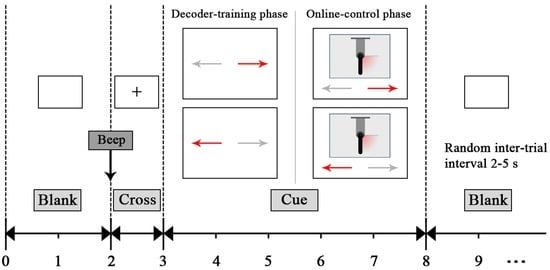 The experiment consists of two phases: the decoder-training phase and the online-control phase. During recording, a quiet environment with dim light was provided to maintain the subjects’ attention level. They were asked to keep all muscles relaxed; in addition, they were also instructed to avoid eye movements, blinks, body adjustments, swallowing or other movements during the visual cue onset. Cues were presented on a computer screen, and occupied about of the visual angle.