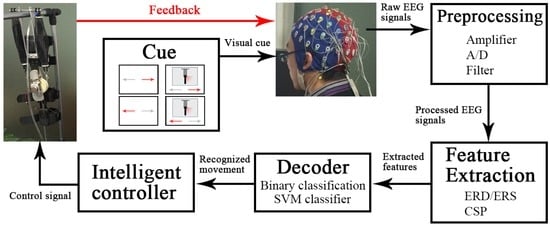 The upper-limb exoskeleton is designed with the goal of restoring functions and assisting activities of daily living (ADL) to those elderly, disabled and injured individuals [,,,]. Electromyography (EMG) and force sensors are two of the widely used control methods to control those exoskeletons based on the user’s motion intention [,,,,,,,]. However, for the seriously amputated and paralyzed people who cannot generate sufficient muscle signals or movements, they are not able to provide the completed EMG and force signals, which will affect the estimation of motion intention. The brain-machine interfaces (BMI) based on electroencephalogram (EEG) have received huge interest due to their potential []. A non-invasive recording procedure is safer and easy to apply, and it is potentially applicable to almost all people including those seriously amputated and paralyzed.