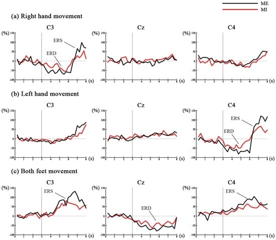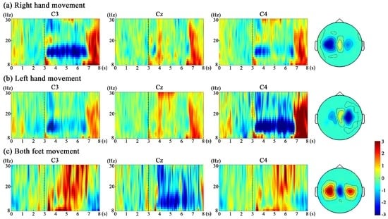 The raw EEG signal was filtered in an 8–30 Hz band. The frequency band was chosen because it includes the alpha and beta frequency bands, which have been shown to be most important for movement classification []. To show the ERD/ERS of each class (left hand movement, right hand movement and both feet movement), the EEG signals of C3, Cz and C4 channels were averaged online over the 3 s preceding and 5 s following cue appearance across all trials and all subjects. ERD/ERS is defined as the percentage of power decrease or power increase in relation to a reference period (in this study 0–1 s) [], according to the expression