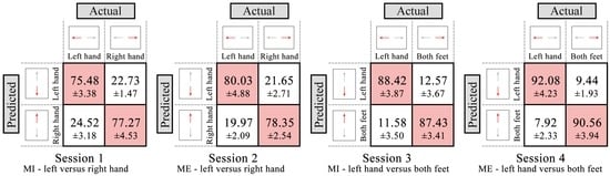 Confusion matrices (in %) for four sessions using S3 classification strategy in the decoder-training phase, averaged across all subjects. The numbers of each entry in the matrix represent the mean value and standard deviation across all subjects. The main diagonal entries stand for the correct classification, and the off-diagonal entries stand for the misclassification.
