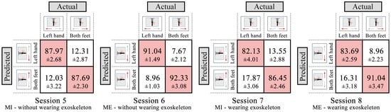 The trained decoder using the selected paradigm was tested in the online-control phase. In two scenarios , subjects performed ME or MI to control the exoskeleton, resulting in four sessions (Session 5: MI, without wearing exoskeleton; Session 6: ME, without wearing exoskeleton; Session 7: MI, wearing exoskeleton; Session 8: ME, wearing exoskeleton). The trained model (LDA classifier) of Session 3 was used in Sessions 5 and 7; the trained model of Session 4 was used in Sessions 6 and 8. The confusion matrices of Sessions 5–8 are shown in Figure 7. The numbers of each entry in the matrix represent the mean value and standard deviation across all subjects. The main diagonal entries stand for the correct classification, and the off-diagonal entries stand for the misclassification. The four sessions achieve mean classification accuracy of 87.83% ± 2.79%, 91.69% ± 2.95%, 84.29% ± 2.11%, and 87.37% ± 3.06%, respectively. The accuracies of ME sessions (Sessions 6 and 8) are higher than MI sessions (Sessions 5 and 7); the accuracies of without wearing exoskeleton sessions (Sessions 5 and 6) are higher than wearing exoskeleton sessions (Sessions 7 and 8). Table 4 shows mean precision, recall and F-score of the two classes of Sessions 5–8 across all subjects. The results show the higher precision, recall and F-score of Sessions 5 and 6 than those of Sessions 7 an 8. ANOVA shows no significant interaction between motor mode and scenario (), while there is a significant main effect of motor mode (F = 30.327, p < 0.001) and scenario (F = 24.502, p < 0.001) for the classification accuracy. These results indicate that without wearing exoskeleton scenario achieves a better classification performance than wearing exoskeleton scenario.