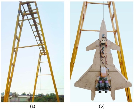 To ensure the safety of the experiment (for both the staff and UAV body) and also for the convenience of the experiment, the UAV does not directly take off and land on the ground. Similarly to the UAV VTOL experiment study in [20], it is hung with a cable under a gantry crane which is shown in Figure 2a. The height of the gantry crane is 7.2 m, and the width is 6.8 m. To avoid the ground effect influencing the thrust performance, the tail of the UAV is hung at about 1.5 m high. As mentioned previously the UAV itself has a length of 2 m, therefore the operating window for the UAV is about 3.5 m. During the experiment, the UAV height is monitored closely to ensure it does not hit the crane. The UAV hanging under the crane is shown in Figure 2b. The experiment is conducted in calm days with wind speed less than 1 km/h to minimize the external disturbance.
