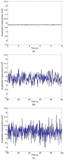 The mean and variance for each of the three acceleration measurements are shown in Table 1. It can be seen that the mean values are very close to each other. The slight difference between them is because of the finite amount of data measured during the experiments. The largest difference is only 0.009 m/s, which is negligible compared with the gravitational acceleration. In this work, gravitational acceleration is adopted as 9.797 m/s which is the average of the three mean values in Table 1. In contrast, the computed variance values differ from each other significantly. When engines are shut down (before start), the variance is very small and it increases dramatically when engine rotor speed is of 33,000 RPM or 85,000 RPM. This is consistent with the observation in Figure 3, since the variance in acceleration represents the intensity of the noise.