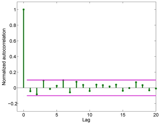 The result of Equation (2) is shown in Figure 4 with the x-axis indicating the lag and the y-axis indicating the normalized autocorrelation of the sampled data. According to Figure 4, the autocorrelation of the acceleration noise can be regarded as an impulse function with high fidelity, which indicates that the acceleration noise can be treated as white noise.