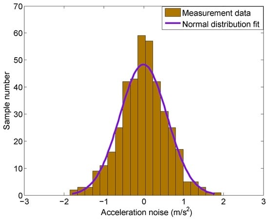 In addition, Figure 5 shows the histogram of the acceleration noise with a normal distribution curve fit (purple line). It can be seen that the normal distribution fits the experimental results very well, which suggests that the noise is of the Gaussian type.