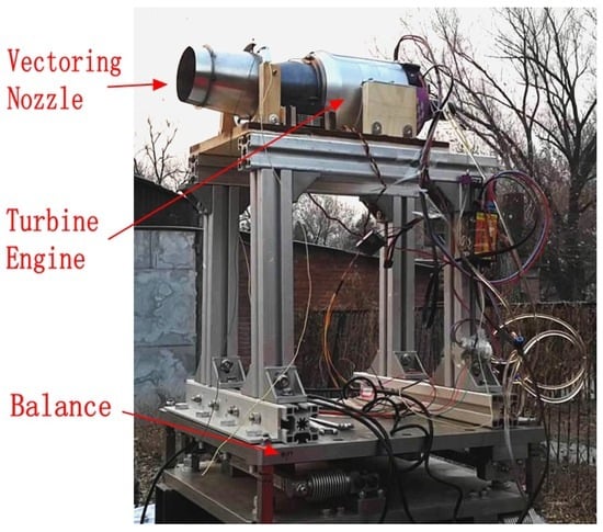 Figure 6 shows the settings for engine thrust ground experiment. A turbine engine and a vectoring nozzle are fixed on a precise balance which can measure the triaxial forces. The detailed descriptions for the turbine engine ground experiment can be found at [24]. For the thrust experiment, the deflection angle of the vectoring nozzle is set to be zero, meaning the nozzle axis is aligned with the engine axis. During the experiment, the rotor speed is fixed at a constant value and the corresponding thrust is measured at the steady state. The rotor speed is then adjusted to different values and the thrust measurements are taken to build the model.