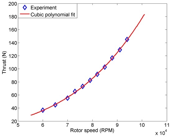 The thrust experiment results for a single P200 engine at steady state are shown in Figure 7 as the blue points for rotor speed ranges from 60,000 RPM to 94,000 RPM. A cubic polynomial function is used to fit the experimental data, and it gives us the red curve as shown in Figure 7. The mathematical expression for the cubic polynomial relationship is written as: